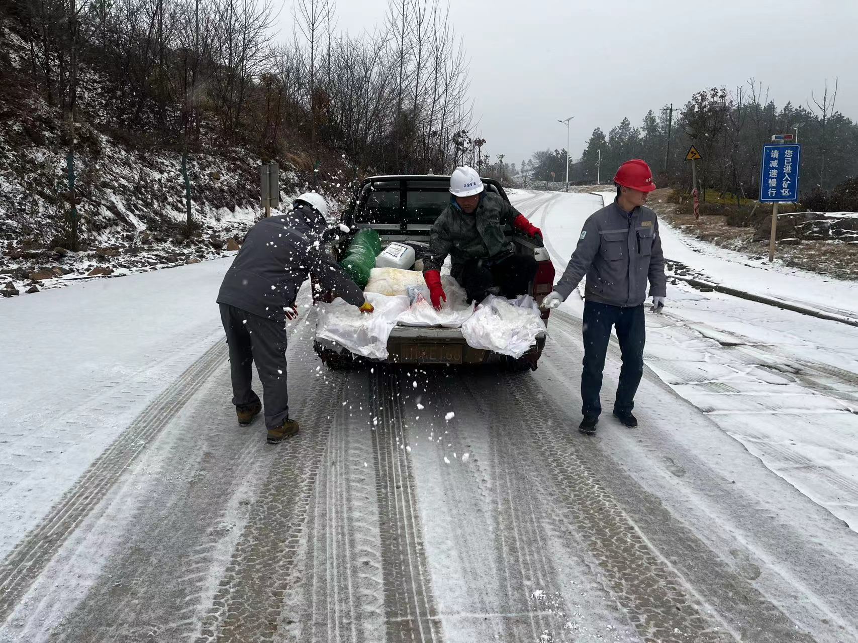 根據(jù)實時天氣變化和道路狀況,興全礦業(yè)提前做好詳細的融雪防滑預案和應急物資準備,第一時間安排人員至運輸?shù)缆窉伻鋈谘﹦M織人工鏟雪,防止道路結冰,保障運輸安全。