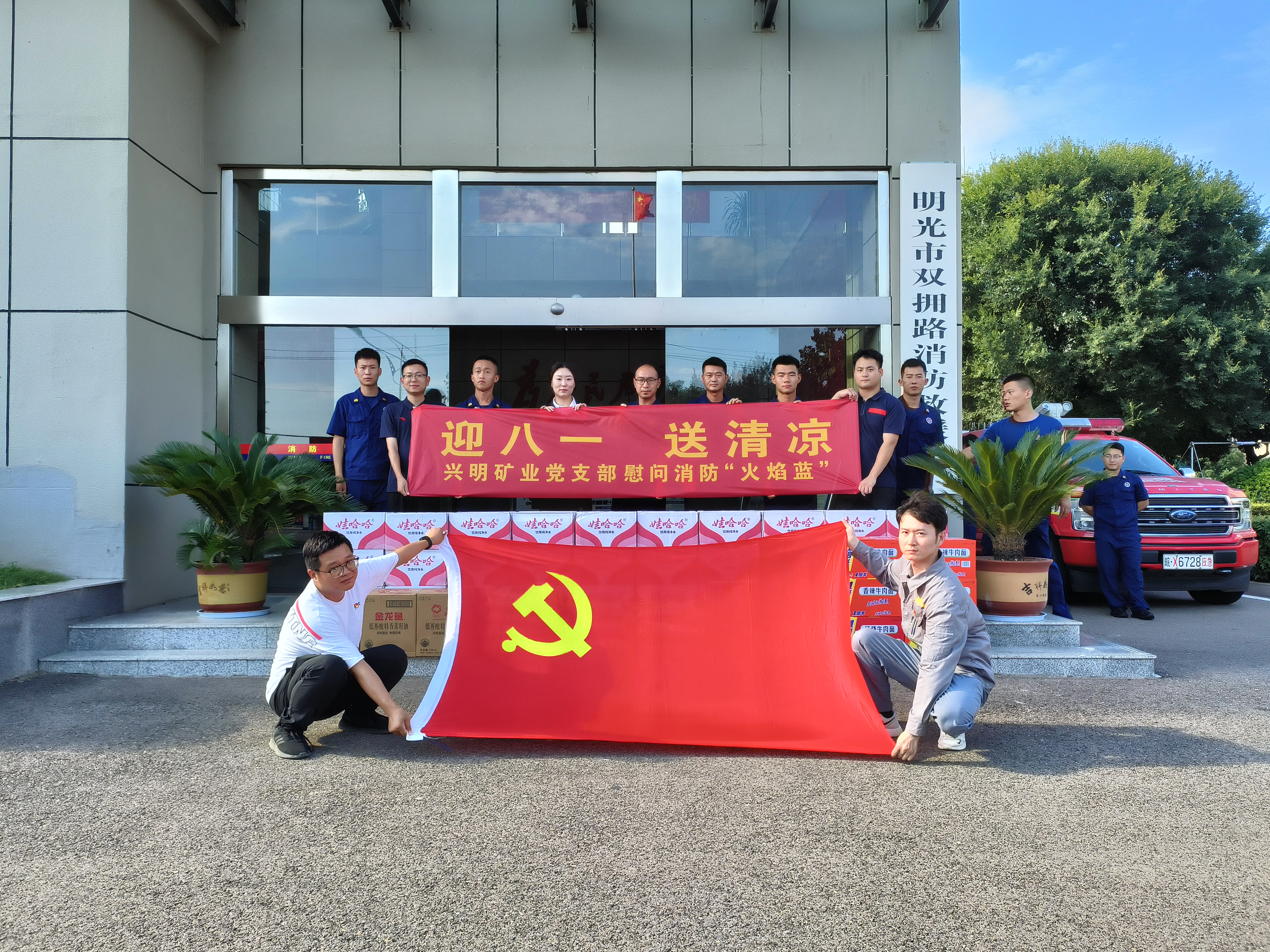 “八一”前夕,興明礦業(yè)黨支部帶著滿滿的關懷與敬意,走進明光市消防救援大隊開展“送清涼”活動,為消防員們送上了礦泉水、方便面等物資。